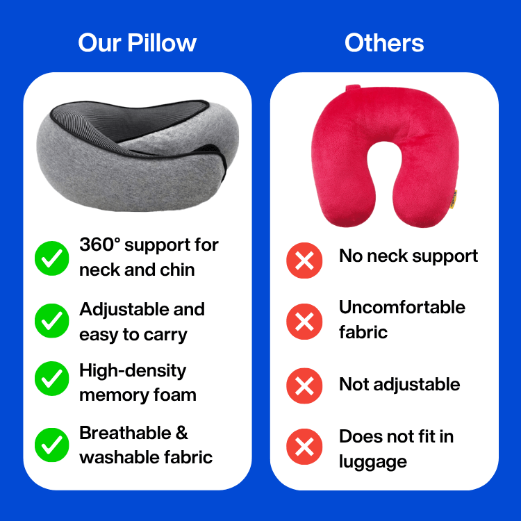 Unlike traditional U-shaped pillows, our PowrTravel™ Premium Neck Pillow is designed with ergonomic 360° neck support and high-quality memory foam, ensuring superior comfort, preventing your head from tilting forward or to the side, eliminating neck strain so you can sleep deeply and wake up refreshed.